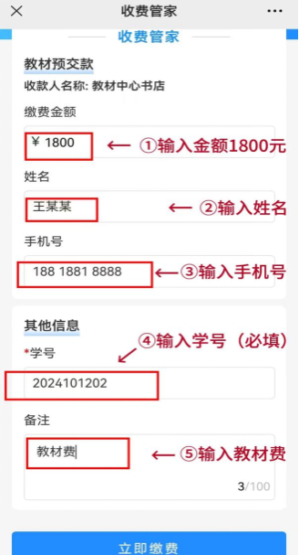 输入金额 1800元 → 输入姓名 → 输入手机号 → 输入录取通知书上的10位数学号(此项非常重要 请勿错填成准考证号)→ 在备注栏输入教材费 → 确认无误后,点击立即缴费完成缴纳。